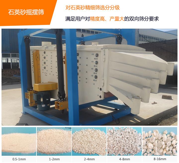 石英砂摇摆式主要是对石英砂精细筛选分级,石英砂摇摆筛筛网常用规格有:0.5-1mm、1-2mm、2-4mm、4-8mm、8-16mm、16-32mm、10-20目、20-40目、40-80目、100-250目。石英砂摇摆筛是解决因旋振筛精度高但产量小、直线筛产量大但精度低这类筛分问题而设计的,该款设备设计预案中具备了筛分精度高、产量大的特性,可以满足用户对精度、产量双向要求的筛分要求。