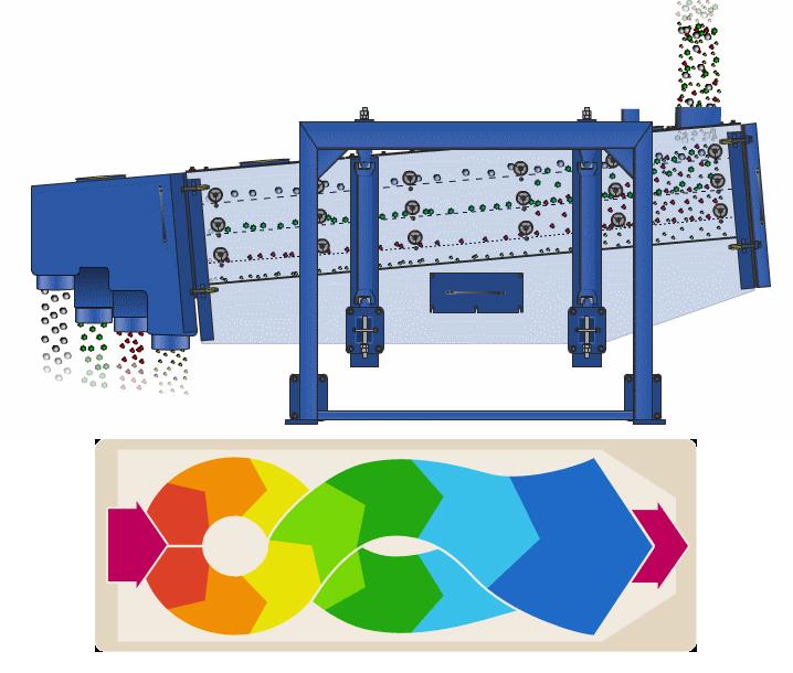 石英砂方形摇摆筛的筛箱在惯性力的作用下作前后往复运动,并带动筛面做周期性摇动,促使筛面上的物料随筛箱一同做定向跳跃式运动,小于筛面孔径的物料通过筛框落到下层,称为筛下物,大于筛面孔径的物料经连续翻滚跳跃运动后从前端排料口排出,继而完成筛分作业。
